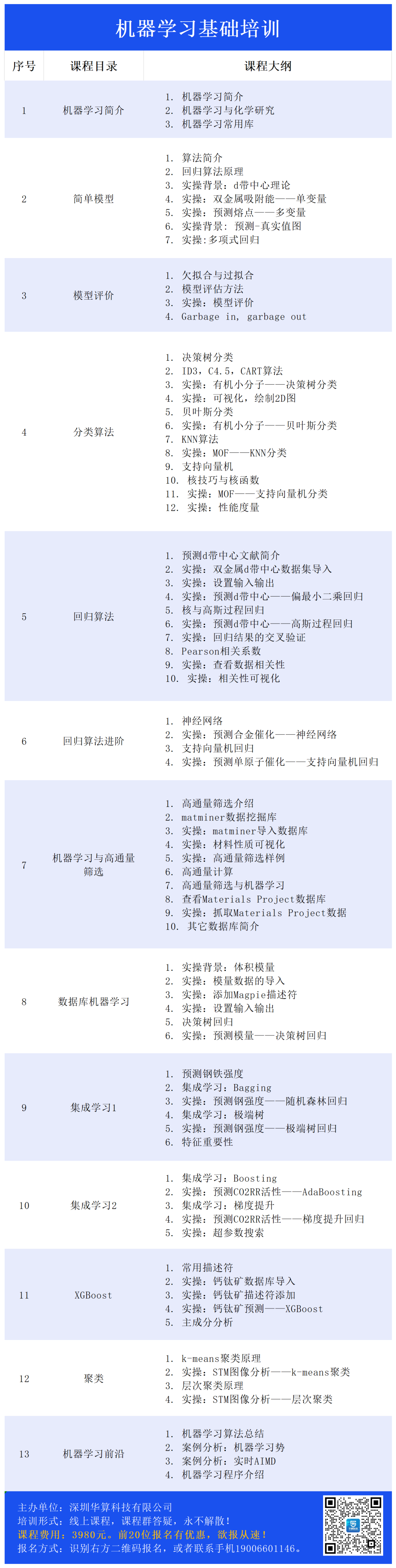 机器学习的使用强烈依赖于代码编写,这常常是化学专业同学们的短板。现有机器学习课程多为计算机方向,无法快速落地到生化环材等学科研究。为了帮助科研人员快速切入新风口,华算科技开设了“机器学习与材料/化学”课程,课程提供无限次回放,建立永不解散的课程群,及时答疑。