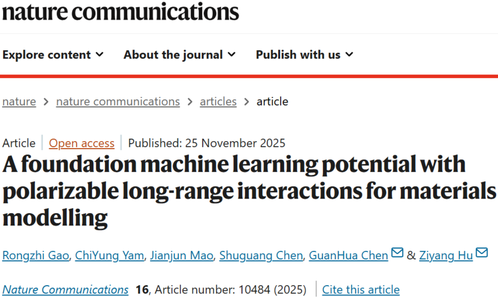 Rongzhi Gao, ChiYung Yam, Jianjun Mao, Shuguang Chen, GuanHua Chen* & Ziyang Hu*, A foundation machine learning potential with polarizable long-range interactions for materials modelling. Nat. Commun. 16, 10484 (2025).
