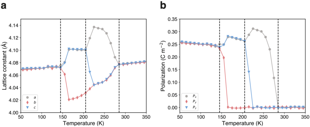 图4. BaTiO3相变过程中的晶格常数与极化率变化。