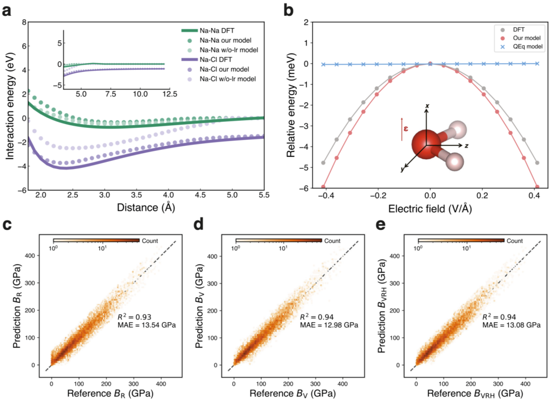 如图2所示,该模型在Na-Na与Na-Cl二聚体的相互作用能预测中,即使在截断半径之外仍能准确复现DFT势能面,而传统完全基于消息传递机制的 MLIPs模型则完全失效。此外,模型在水分子极化响应、超过一万种材料的体积模量预测等方面也表现出色。