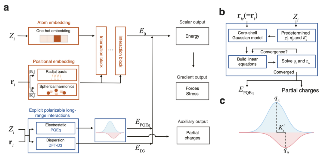 本文构建了一个融合神经网络势与显式可极化长程相互作用的理论框架。如图1所示,模型将总势能分解为神经网络输出的能量、基于PQEq方法的静电能量以及DFT-D3色散校正能量,从而实现对长程静电与极化效应的精确建模。