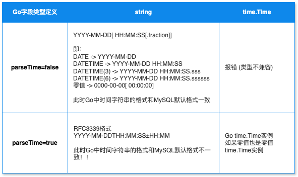 parseTime=true时,Go的MySQL驱动首先尝试将 MySQL的 DATETIME/DATE(MySQL)解析为 Go 的 time.Time对象,当发现目标字段是