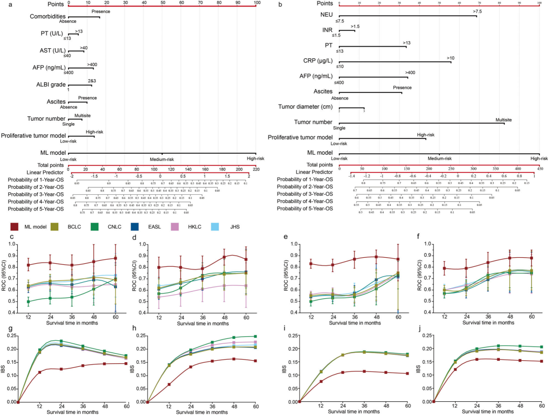 预测准确性评估:与传统分期系统(BCLC、JSH、CNLC、EASL、HKLC)相比,定制列线图表现显著优越。TACE组训练集td-AUC为0.83(95%CI 0.64~1.00),测试集为0.87(95%CI 0.75~0.98);HAIC组训练集td-AUC为0.87(95%CI 0.68~1.00),测试集为0.88(95%CI 0.81~0.95)。DeLong检验显示差异均具有统计学意义(P<0.001)。IBS分析显示,TACE列线图为0.146,HAIC列线图为0.106,均优于传统分期框架(0.165~0.227)。