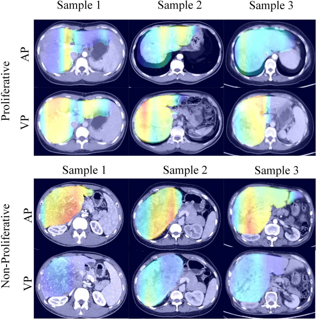 图2 PMN模型在训练集和测试集中使用射线图的性能表现图3 PMN与临床因素的AUC ROC用于预测不同模型间的增殖亚型模型可解释性:PMN生成的特征热图显示,预测增殖型HCC的病例在门静脉期呈现更高信号强度,而非增殖型肿瘤在门静脉期较动脉期增强减弱。这种时相特异性信号差异可能反映了潜在的代谢重编程和免疫微环境改变。预测生存期较长患者的特征图显示更高信号强度,提示增殖型肿瘤相关特征对生存预测具有重要价值。