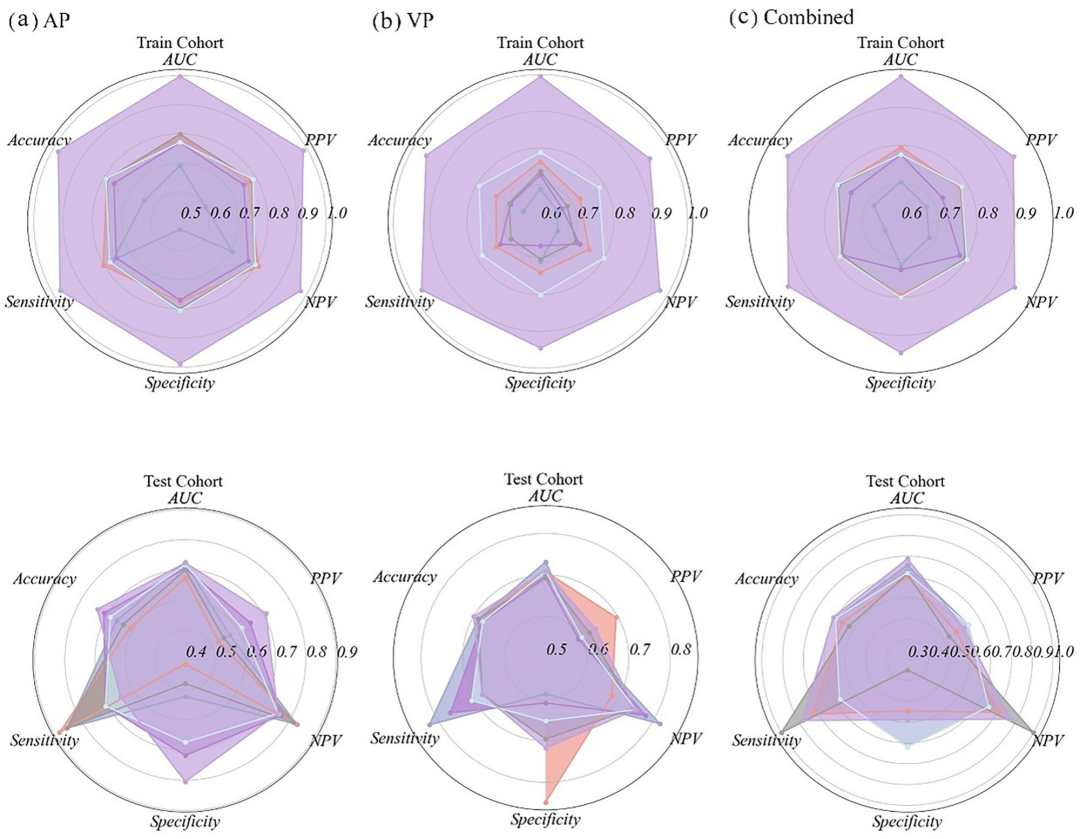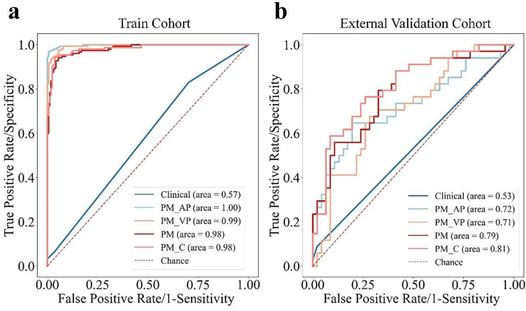 模型诊断性能:基于动脉期和门静脉期联合图像训练的PMN模型性能最优。在训练集中,检测增殖型HCC的AUC为0.825(95%CI 0.781~0.884),测试集AUC为0.792(95%CI 0.732~0.841)。训练集风险评分显著区分增殖型与非增殖型肿瘤(0.65±0.07 vs 0.43±0.07,P<0.001),测试集同样显示良好区分度(0.59±0.09 vs 0.49±0.08,P<0.001)。与8种2D模型(MobileNetV2、VGG19等)和5种3D模型相比,PMN架构在特征提取和分类准确性上均表现优越。