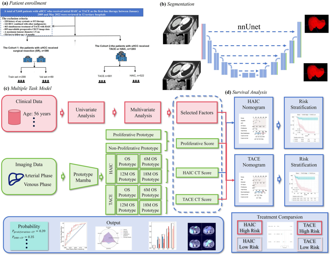 近期研究表明,增殖型HCC对TACE和手术切除的反应较差。一项随机III期研究显示,对于直径大于7cm的肿瘤,HAIC的客观缓解率(ORR)和总生存期(OS)均优于TACE。然而,肿瘤组织学、影像学表型及其他肿瘤特异性生物学因素对治疗效果的影响仍不清楚。影像组学研究主要集中于肿瘤本身,但在大HCC中观察者间差异显著。结合肿瘤及周围肝组织的影像特征可提供更准确的预测。深度学习(DL)在医学影像分析中展现出超越专家水平的预测能力,但尚无专门针对uHCC预后建模或评估HAIC与TACE优选方案的转化框架。因此,开发基于影像特征的深度学习模型,实现增殖型HCC的非侵入性诊断和个体化IAT选择,具有重要的临床价值。