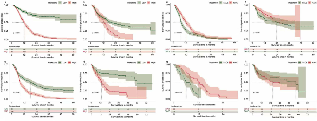 图5 多模态深度学习模型的开发及其与其他分期系统的比较治疗选择优化:经过1:1倾向评分匹配后,高风险患者中HAIC组中位OS显著优于TACE组(训练集:12.2个月 vs 7.8个月,P<0.001;测试集:12.1个月 vs 6.6个月,P<0.001)。然而,在低危患者中,两组OS差异无统计学意义(训练集:42.2个月 vs 24.1个月,P=0.085;测试集:57.6个月 vs 25.2个月,P=0.560)。这表明基于DL的风险分层可有效识别从HAIC中获益的优势人群。