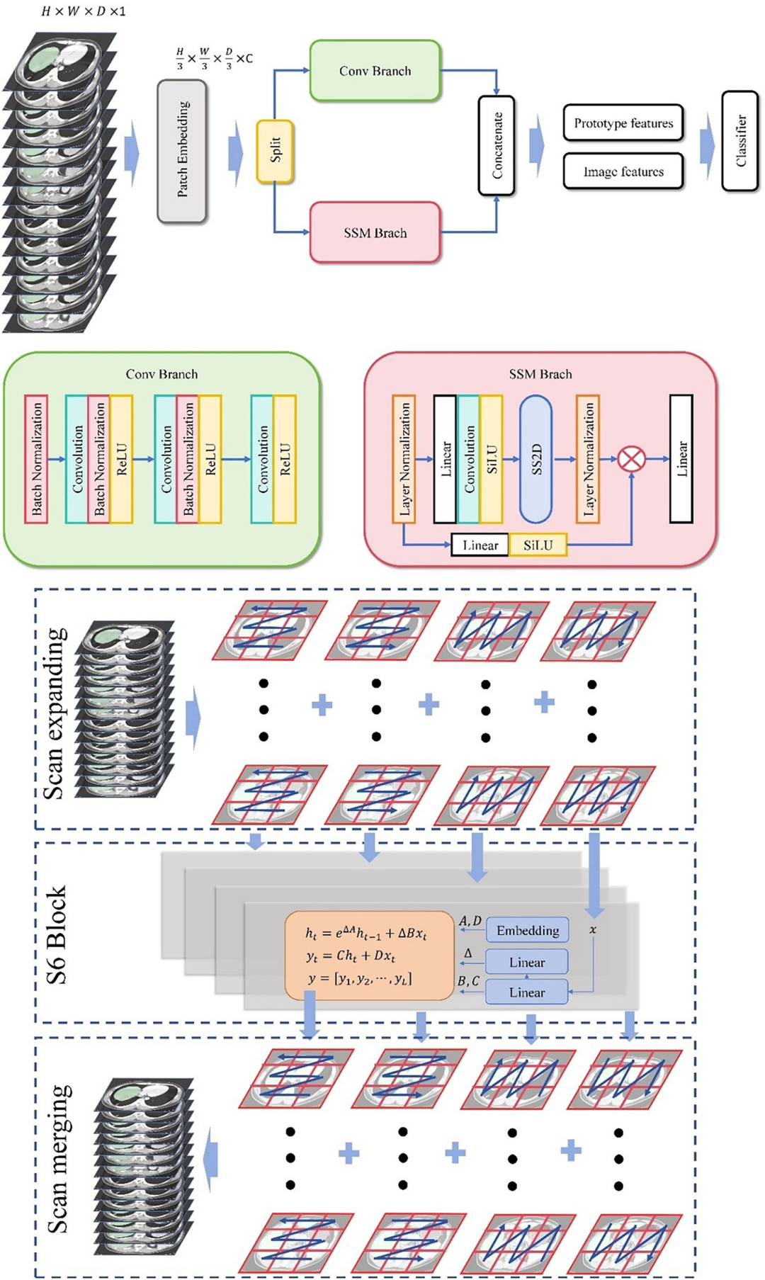深度学习模型构建:采用nnUNet预训练模型自动分割全肝和肿瘤区域,选择全分辨率3D U-Net配置。开发新型PMN架构,输入3D CT图像(H×W×D),通过patch embedding投影为(H/3×W/3×D/3)。PMN由卷积分支(提取局部特征)和状态空间模型(SSM)分支(提取全局特征)构成,结合增殖型/非增殖型原型、HAIC/TACE疗效原型进行多任务学习。损失函数采用距离交叉熵和交叉熵联合优化,使用Adam优化器(学习率0.00001,batch size 32),训练800个epoch。