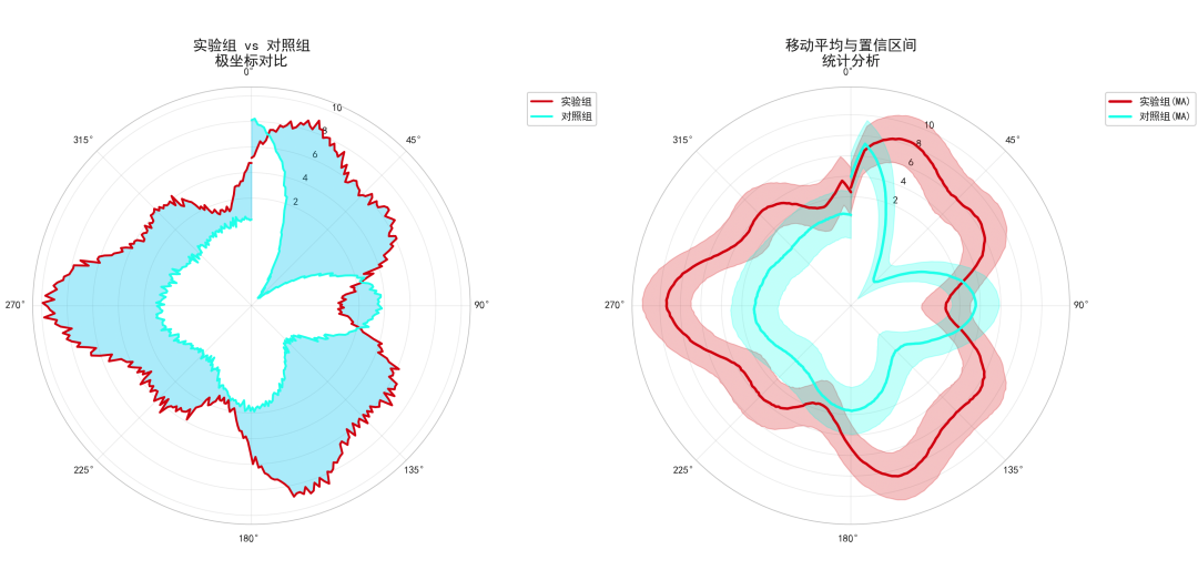 ax1.set_title('实验组 vs 对照组\n极坐标对比', fontsize=14, fontweight='bold', pad=20)