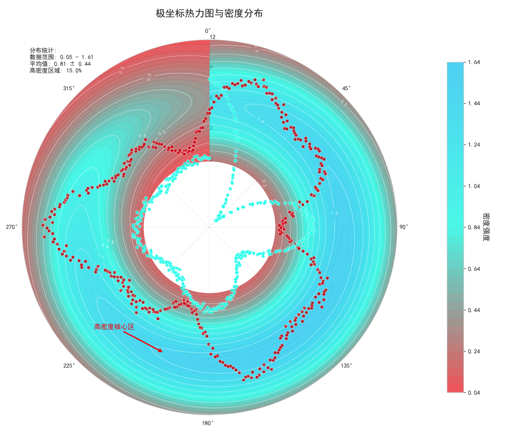 - 极坐标热力图与等高线组合图:适合展示二维密度分布和梯度变化
