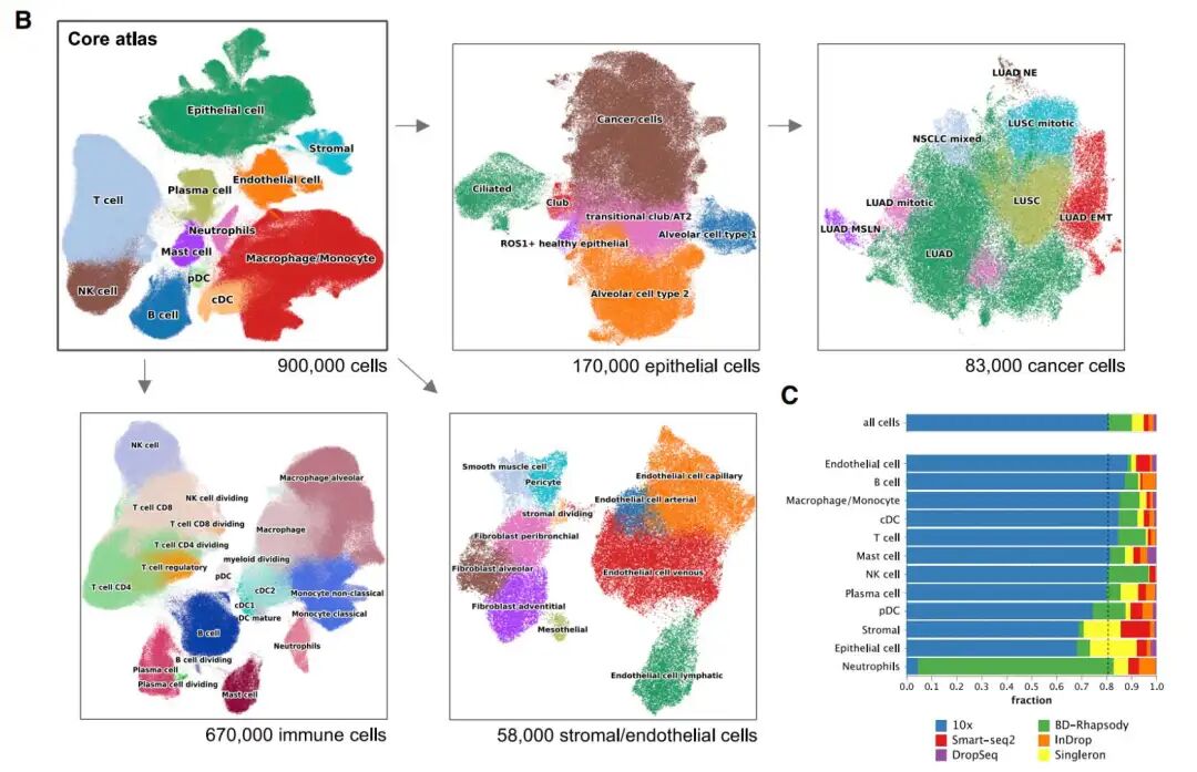 前提回顾 作者的核心内容为通过整合19项研究、21个数据集共计298名患者的505份样本(图1A), 首次构建了非小细胞肺癌核心图谱 。核心图谱共整合 898,422 个单细胞,将其注释为12个粗粒度细胞类型及44个主要细胞亚型/状态(如分裂期细胞),包括169,223个上皮细胞、670,409个免疫细胞及58,790个基质与内皮细胞(图1B)。