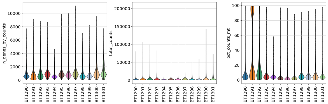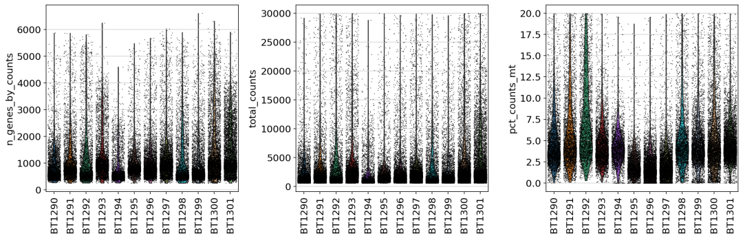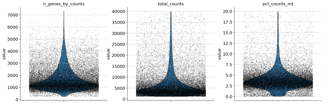 # 基本过滤 sc.pp.filter_cells(adata1, min_genes= 250 ) sc.pp.filter_genes(adata1, min_cells= 3 ) ## 过滤 # 方法2:一次性过滤所有条件(更高效) adata1 = adata1[ (adata1.obs[ 'n_genes_by_counts' ] > 250 ) & (adata1.obs[ 'n_genes_by_counts' ] 10000 ) & (adata1.obs[ 'total_counts' ] > 1200 ) & (adata1.obs[ 'total_counts' ] 40000 ) & (adata1.obs[ 'pct_counts_mt' ] 20 ), : ].copy() 过滤后的小提琴: