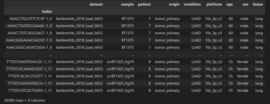 AnnData object with n_obs × n_vars = 36589 × 36601 obs: 'dataset' , 'sample' , 'patient' , 'origin' , 'condition' , 'platform' , 'age' , 'sex' , 'tissue' 已有的细胞信息: