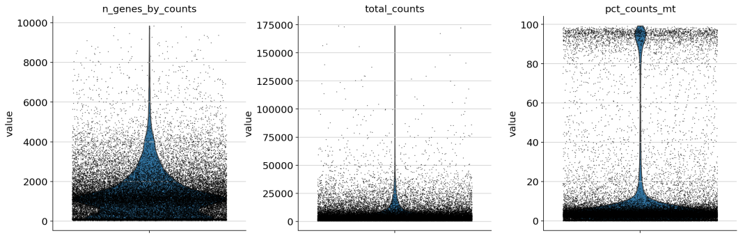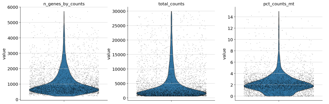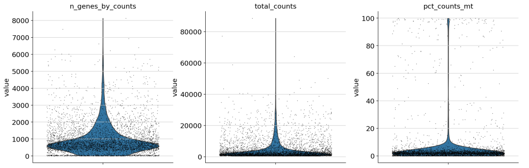 ## 未过滤前的小提琴分布 sc.pl.violin( adata1, [ "n_genes_by_counts" , "total_counts" , "pct_counts_mt" ], jitter= 0.4 , # **{"color": "#f8766d "}, # 使用额外的参数来设置颜色 multi_panel= True ) 3.过滤 根据作者给的指标进行过滤: