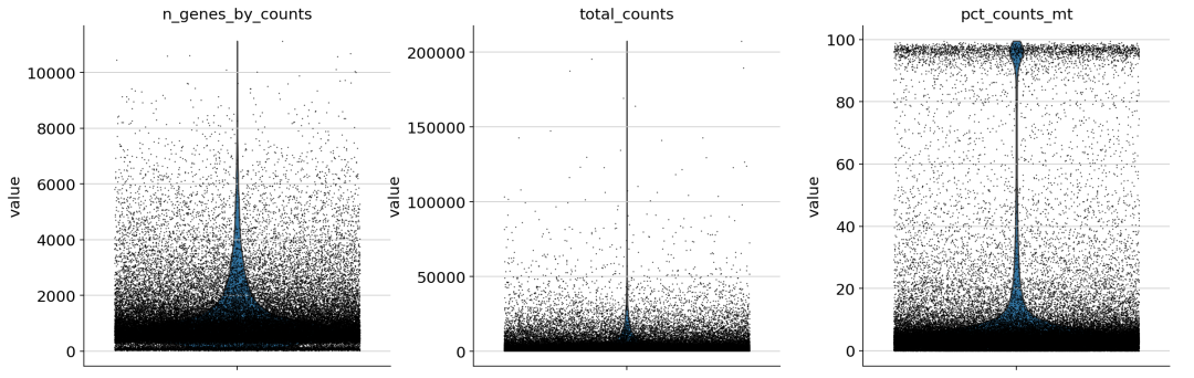 'n_genes_by_counts' ] > 200 ) & (adata_v1.obs[ 'n_genes_by_counts' ] 10000 ) & (adata_v1.obs[ 'total_counts' ] > 600 ) & (adata_v1.obs[ 'total_counts' ] 30000 ) & (adata_v1.obs[ 'pct_counts_mt' ] 15 ), : ].copy() ## 过滤后的数据 adata_v1.shape ( 4062 , 19039 ) ## 过滤后的小提琴分布 sc.pl.violin( adata1, [ "n_genes_by_counts" , "total_counts" , "pct_counts_mt" ], jitter= 0.4 , # **{"color": "#f8766d "}, # 使用额外的参数来设置颜色 multi_panel= True ) ## 保存数据 adata_v1.write( "lambrechts_2018_luad_6149v1_qc.h5ad" ) 未过滤前的小提琴分布: