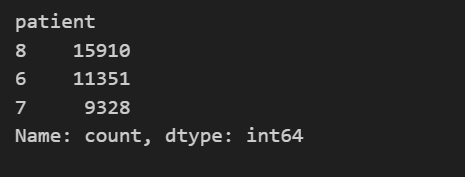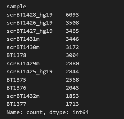 # 样本数 adata1.obs[ 'sample' ].nunique() adata1.obs[ 'sample' ].value_counts() # patients 数 adata1.obs[ 'patient' ].value_counts()