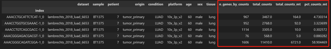 1.读取数据: # %% #"../../data/20_integrate_scrnaseq_data/02_qc_and_filtering/Lambrechts_2018_LUAD_6653/Lambrechts_2018_LUAD_6653.qc.h5ad", adata1 = sc.read_h5ad( nxfvars.get( "adata_qc" , "./data/12_input_adatas/lambrechts_2018_luad_6653.h5ad" ) ) adata1 adata1的内容如下: