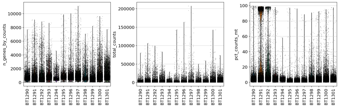 "pct_counts_mt" ], jitter=0.4, # **{"color": "#f8766d "}, # 使用额外的参数来设置颜色 multi_panel=True ) ## 3.过滤 # 基本过滤 sc.pp.filter_cells(adata_v2, min_genes=250) sc.pp.filter_genes(adata_v2, min_cells=3) ## 过滤 # 方法2:一次性过滤所有条件(更高效) adata_v2 = adata_v2[ (adata_v2.obs[ 'n_genes_by_counts' ] > 250) & (adata_v2.obs[ 'n_genes_by_counts' ] < 10000) & (adata_v2.obs[ 'total_counts' ] > 600) & (adata_v2.obs[ 'total_counts' ] < 30000) & (adata_v2.obs[ 'pct_counts_mt' ] < 20), : ].copy() ## 过滤后的数据 adata_v2.shape # (48397, 26927) ## 过滤后的小提琴分布 sc.pl.violin( adata1, [ "n_genes_by_counts" , "total_counts" , "pct_counts_mt" ], jitter=0.4, # **{"color": "#f8766d "}, # 使用额外的参数来设置颜色 multi_panel=True ) ## 过滤的小提琴分布 sc.pl.violin( adata_v2, [ "n_genes_by_counts" , "total_counts" , "pct_counts_mt" ], jitter=0.4, groupby= "sample" , # **{"color": "#f8766d "}, # 使用额外的参数来设置颜色 multi_panel=True, rotation=90 # 旋转x轴标签90度 ) ## 保存数据 adata_v2.write( "lambrechts_2018_luad_6149v2_qc.h5ad" ) 未过滤前的小提琴分布:
