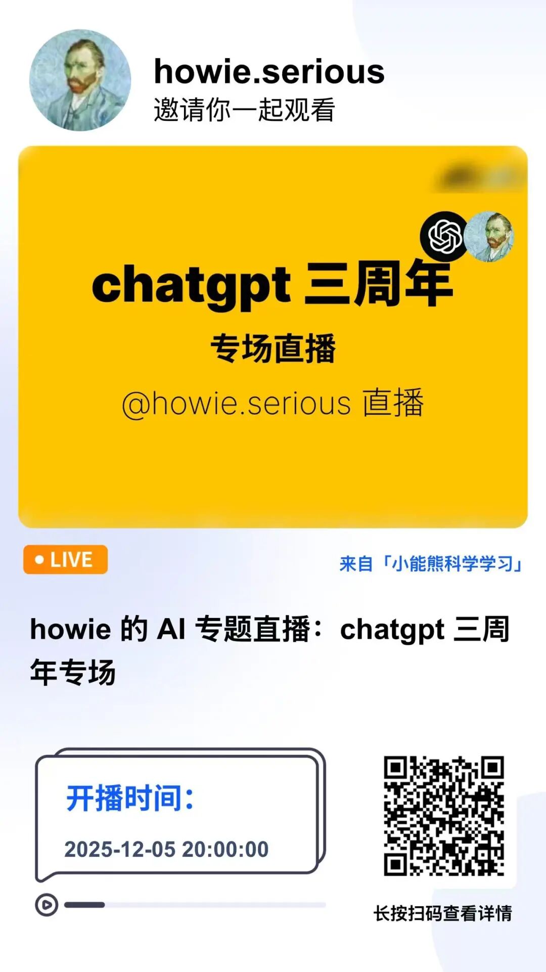 对于相信“ai 非小事”的人,今晚 8 点,我们可以来一个主题“聚会”:在直播间,相聚一堂,借着 chatgpt3 周年的机会,对这 3 年的 ai 进行一场主题活动。