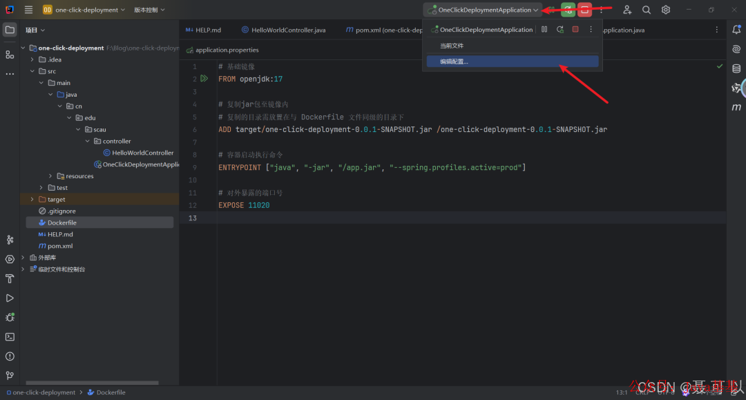 接着需要编写一个用于定义和构建 Docker 镜像的文本文件,文件名为 Dockerfile,Dockerfile 中的配置可根据自身项目情况进行调整