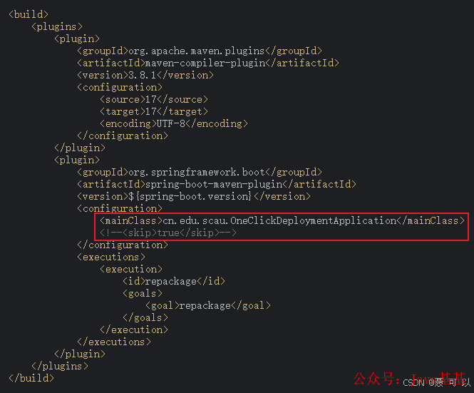 解决方法:修改项目的 pom.xml 文件,同时确保 SpringBoot 打包插件生效了(skip 属性默认为 false,表示启用打包插件)
