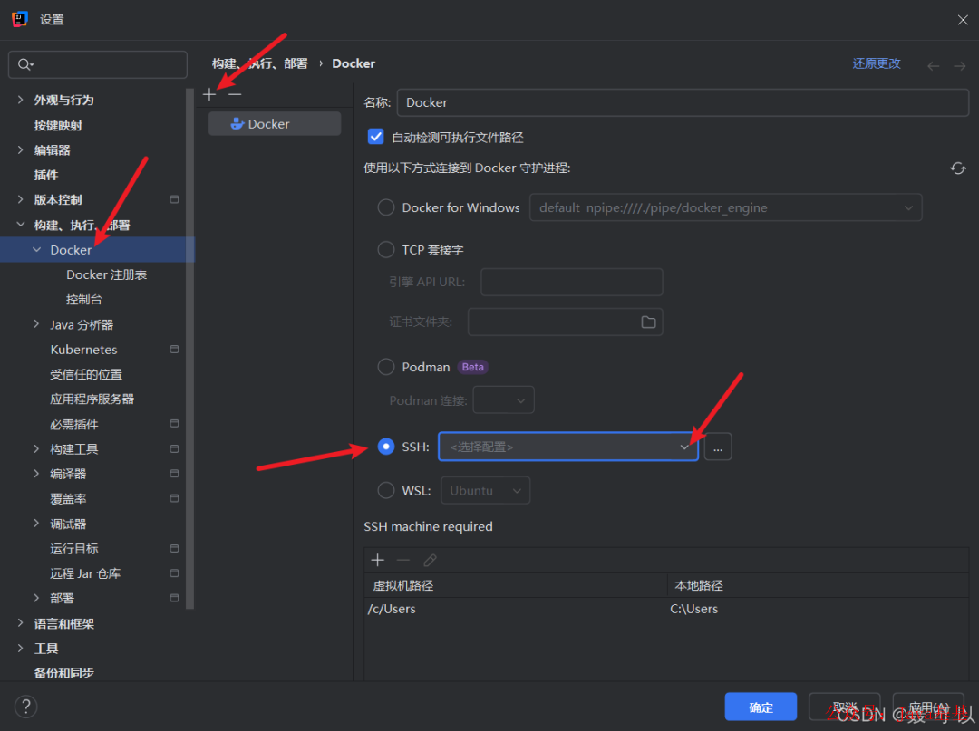 在设置中找到 Docker,点击 +,选择以 SSH 方法连接到 Docker 守护进程,接着点击下拉列表,选择刚才创建的 SSH 配置