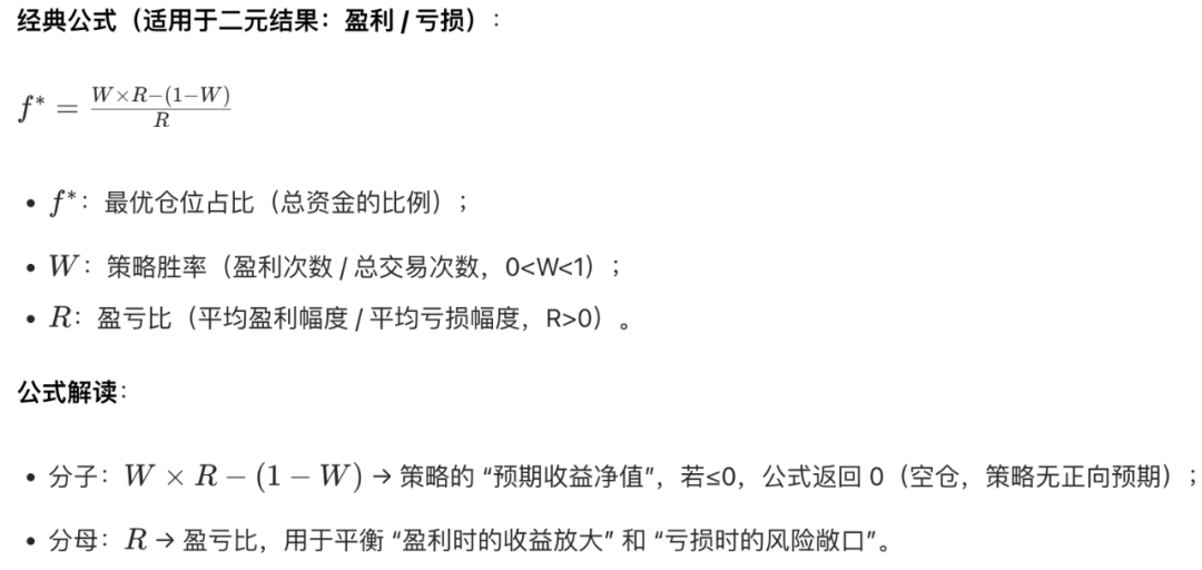 凯利公式是量化交易中 唯一能从数学上证明“最大化长期复利收益” 的仓位管理策略,核心是“让仓位与策略的风险收益特征精准匹配”——既避免过度保守导致收益稀释,也防止过度激进引发不可逆亏损。以下从 数学本质、实战拆解、参数校准、风险优化、量化落地 五个维度,完整还原凯利公式的应用逻辑,兼顾理论严谨性与实操可行性。