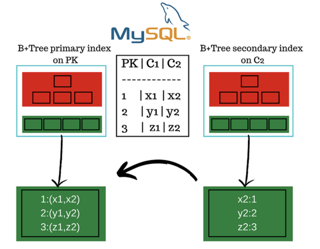 在 MySQL 中,这条查询会涉及两次 B+ 树查找操作。首先,通过 C2 列的二级索引查找字段 C2 值为 'x2' 的记录,获取其对应的主键值 1;接着再通过主键索引查找主键为 1 的那一行数据,从而获取整行记录( * 表示所有的字段)。