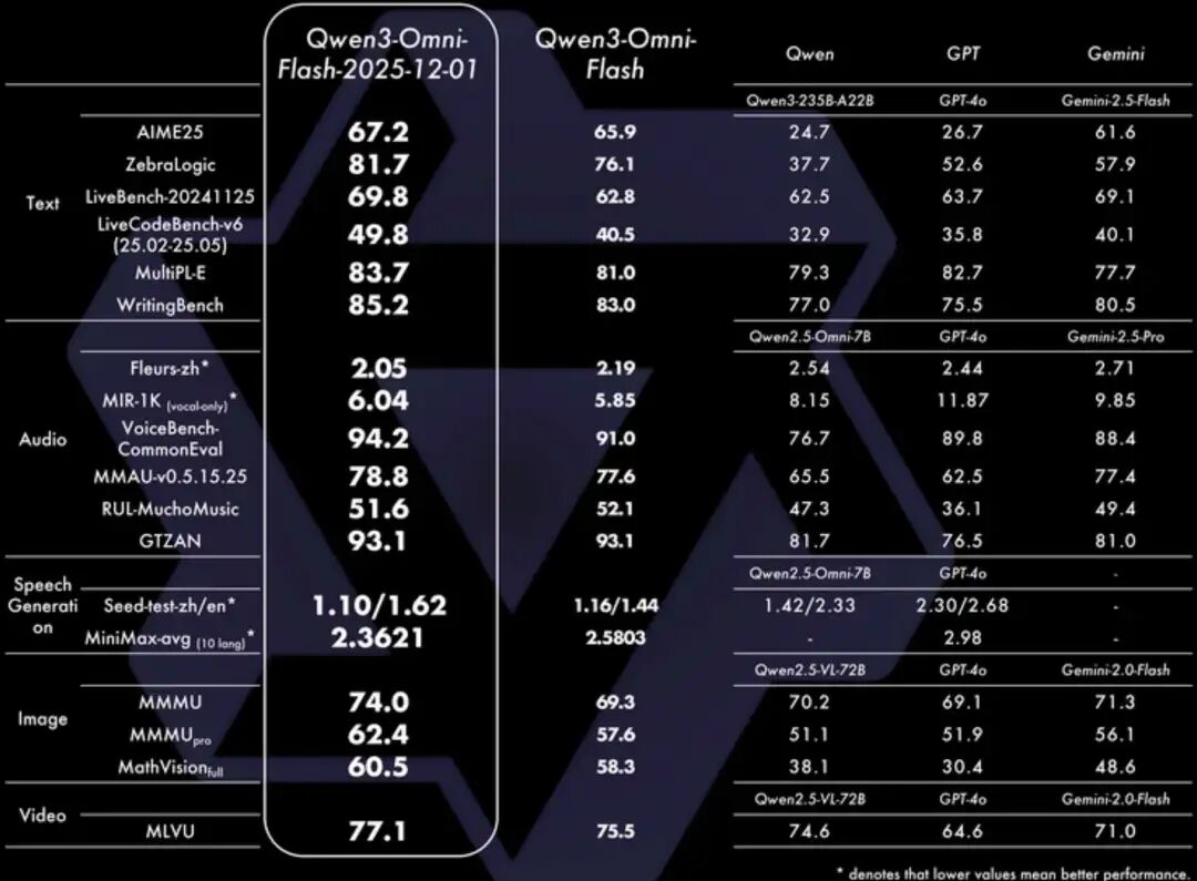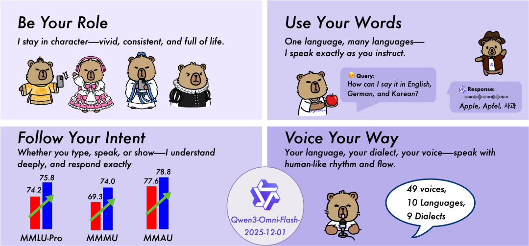 #4 Qwen 发布了 Qwen3-Omni-Flash-2025-12-01 ,这是在 Qwen3-Omni 基础上进行全面升级的新一代原生全模态大模型,能够无缝处理文本、图像、音频和视频等多种输入形式,并通过实时流式响应同时生成文本与自然语音输出。