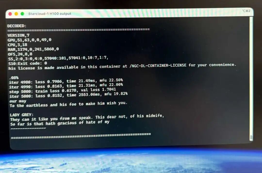 Nvidia 支持的 Starcloud 公司宣布,已在轨道上的 Starcloud-1 卫星上,使用一块 Nvidia H100 GPU 成功进行了AI模型的训练与推理,标志着“轨道服务器农场”概念的实现。