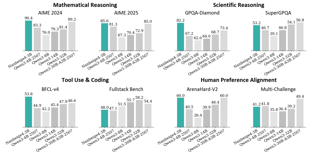 Nanbeige4-3B-Base 模型在多项基准测试中表现超越同规模及更大规模的模型,而 Nanbeige4-3B-Thinking-2511 作为增强版本,在数学、工具使用及创意写作等任务上达到了新的水平。