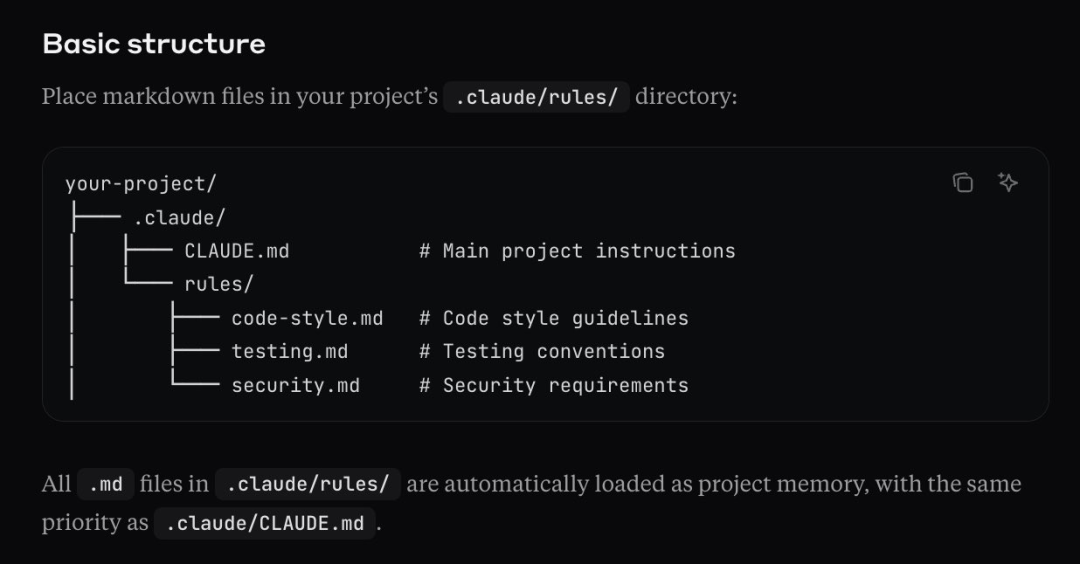 Claude Code 现已支持通过 .claude/rules/ 目录加载自定义规则,开发者可以将代码风格、测试规范和安全需求等以 .md 文件形式放入该目录,这些文件会自动加载,且优先级与 CLAUDE.md 文件相同。