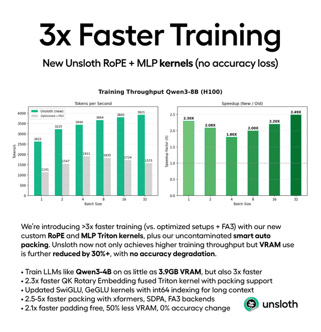 Unsloth发布新内核加速LLM训练 #18 Unsloth AI 发布了新的 Triton 内核和智能自动打包支持,旨在将大语言模型的训练速度提升 3 倍,在某些情况下甚至可达 5 倍,同时减少 30% 至 90% 的VRAM使用,且不损失模型准确性。