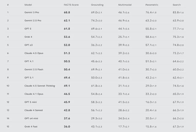 在首次评估结果中, Gemini 3 Pro 综合排名第一,得分为 68.8% 。与上一代模型 Gemini 2.5 Pro 相比,其在Search基准上的错误率降低了