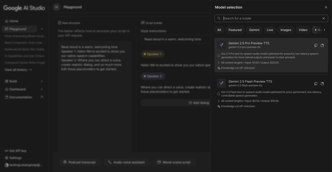 Gemini API 访问最新的 Gemini 2.5 Flash TTS 和 2.5 Pro TTS 模型。