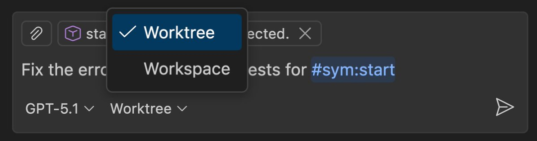 新版本中Agent sessions直接集成到Chat视图,提供统一的管理界面。开发者可以在此查看所有会话的状态、任务进度和文件更改情况,支持会话归档以保持界面整洁,并能随时选择任意会话查看完整的对话历史记录。新版本支持基于 Git worktrees 的isolated background agents,使多个后台Agent能够在各自独立的工作区中并行运行而互不干扰。升级实现了跨agents的无缝任务委托功能。开发者可在本地Agent中启动任务,通过"Continue in"选项随时将工作交接给后台或云端Agent,聊天上下文会自动转移,原会话在完成交接后自动归档。