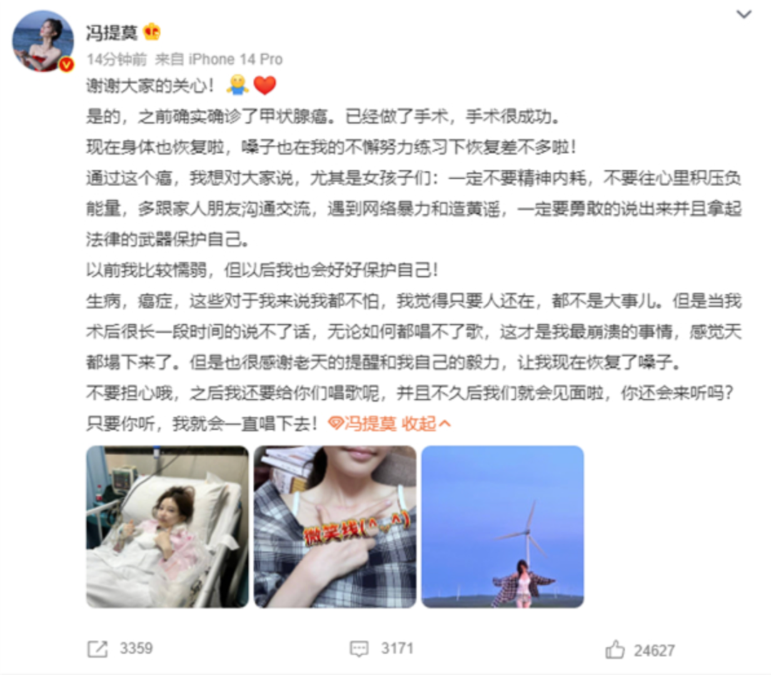3000 万粉丝网红冯提莫复播:自称停播因甲状腺癌复发转移