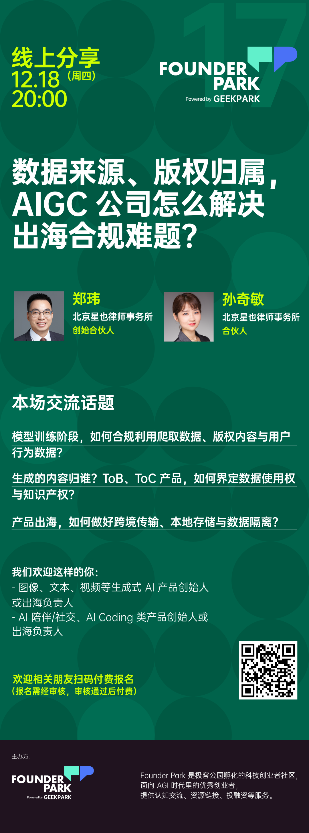 本期 workshop 中,我们邀请到了北京星也律师事务所的两位合伙人郑玮、孙奇敏,针对 AIGC 创业公司,聊聊如何规避在出海过程中会遇到的一系列合规、高风险问题。