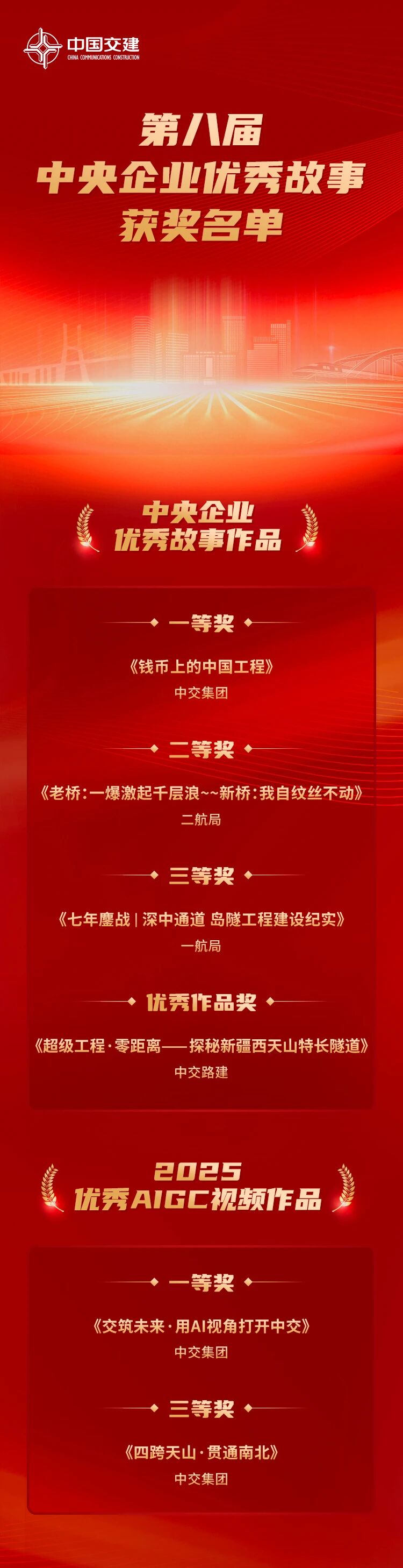 12月10日,由国务院国资委宣传局、中国外文局、人民网联合主办的第八届中央企业优秀故事暨2025AIGC创意传播作品发布展示活动在北京举行,现场发布优秀故事作品、优秀AIGC视频作品、优秀AI+IP形象应用案例等多类荣誉。其中,中交集团共有4部作品获中央企业优秀故事奖,2部作品获2025优秀AIGC视频奖。