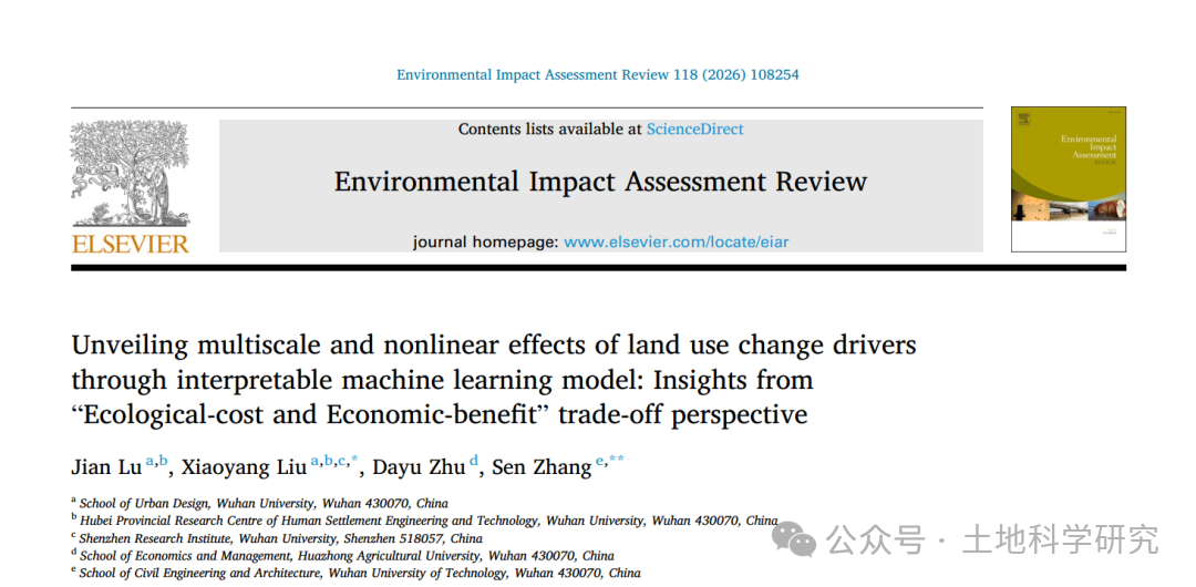 原文请见:Lu, J., Liu, X., Zhu, D., & Zhang, S. (2026). Unveiling multiscale and nonlinear effects of land use change drivers through interpretable machine learning model: Insights from “Ecological-cost and Economic-benefit” trade-off perspective. Environmental Impact Assessment Review, 118, 108254.