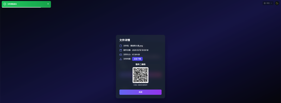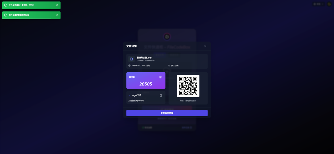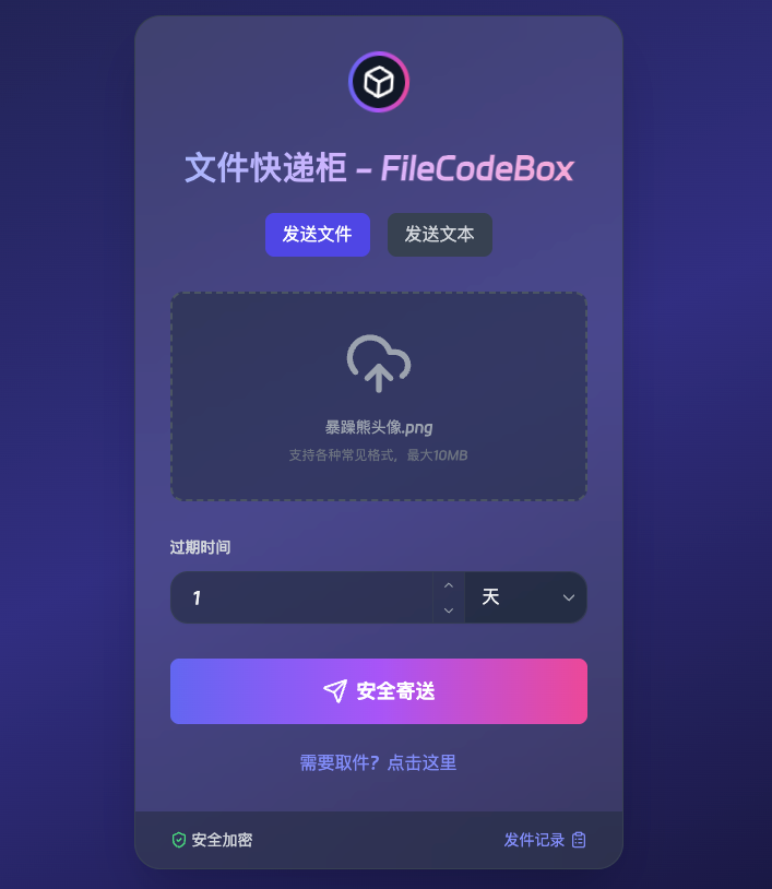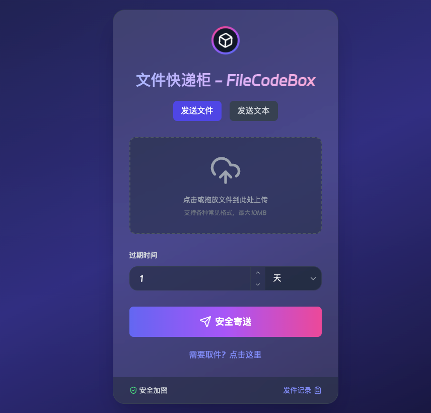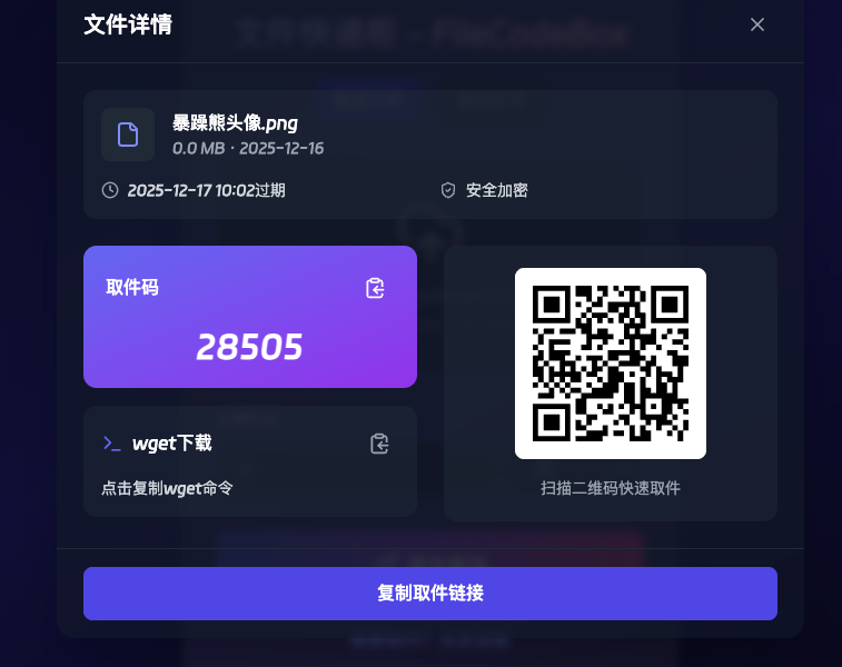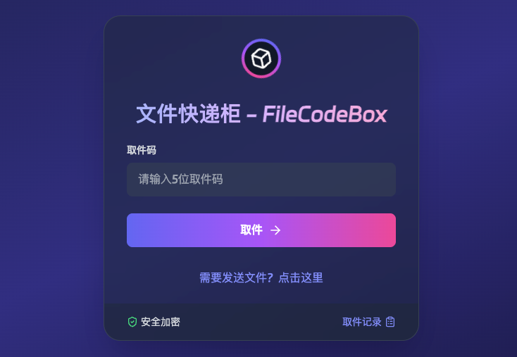 注意,如果是第一次安装,请查看docker日志获取初始密码和后台地址,参考指令 后台本地文件列表,需要将服务器文件移动至目录/opt/FileCodeBox/data/locals,这样就可以显示了。