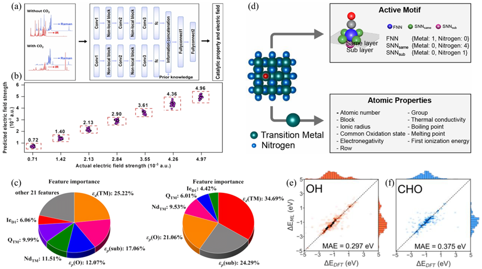 图6.(a)M@g-C3N4上CO2吸附能的ML辅助预测工作流程。(b)采用基于注意力的神经网络,通过红外和拉曼光谱分析对电场强度进行逆向预测。(c)XGBR采用27(左)和6(右)特征的特征重要性。(d)生成活性基序的表示以预测结合能。(e)和(f)使用m-DSTAR的ML预测结合能与通过DFT计算的结合能之间的比较图。