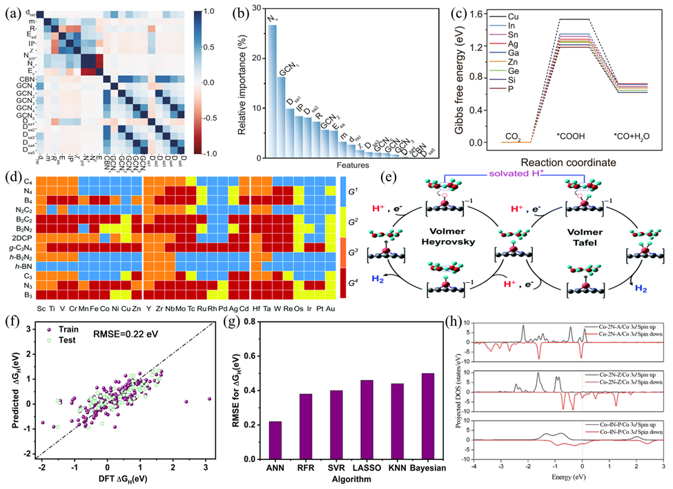 图7. (a) 基于皮尔逊相关系数分析得出的特征相关性热力图。(b) 基于平均影响因子评估的特征重要性排序。(c) 吉布斯自由能景观图展示了CO2还原为*CO的过程。(d)根据TM嵌入技术对金属体凝聚能与电化学溶解电位进行分类的二维表面稳定性:G1:不可聚合且不可溶解;G2:可聚合且不可溶解;G3:不可聚合且可溶解;G4:可聚合且可溶解。(e)不同二维表面上提出的电催化反应循环机制与路径。(f) 神经网络预测吉布斯自由能(ΔGH)的有效性。(g) 不同算法预测ΔGH的均方根误差。 (h) Co-2N-A、Co-2N-Z及Co-4N-P模型中钴3d轨道态密度投影图。