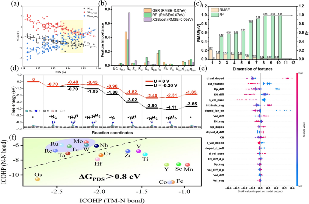 图8. (a) N≡N键距与关键NRR步骤中吉布斯自由能变化的相关性。(b) 特征重要性分析。(c) GBR方法下特征空间维度增加时均方根误差(RMSE)与决定系数(R²)的变化趋势。(d) Mo–B₂CN–(邻位B)分子零势能面及势能决定步骤的自由能图谱,含相关中间态。(e) ΔG*N2→*NNH预测的Shapley加性解释图。(f) 通过评估TM-N与N-N键的ICOHP值筛选高活性TM@C6N2纳米片的选择策略示意图。