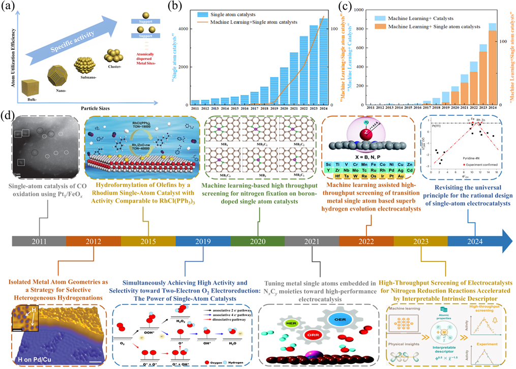 的概念于2011年正式提出。到2012年,单原子合金催化剂首次应用。2015年,SACs取代了均相催化剂。ML从2019年开始应用于SAC。2020年,ML驱动的掺硼SACs高通量筛选用于固氮。2021年,ML协助设计了高性能电催化剂。2022年,ML协助过渡金属单原子的高通量筛选。到2023年,可解释的内在描述符加速了电催化剂的高通量筛选。2024年对支撑单原子电催化剂合理设计的普遍原理的重新审视。