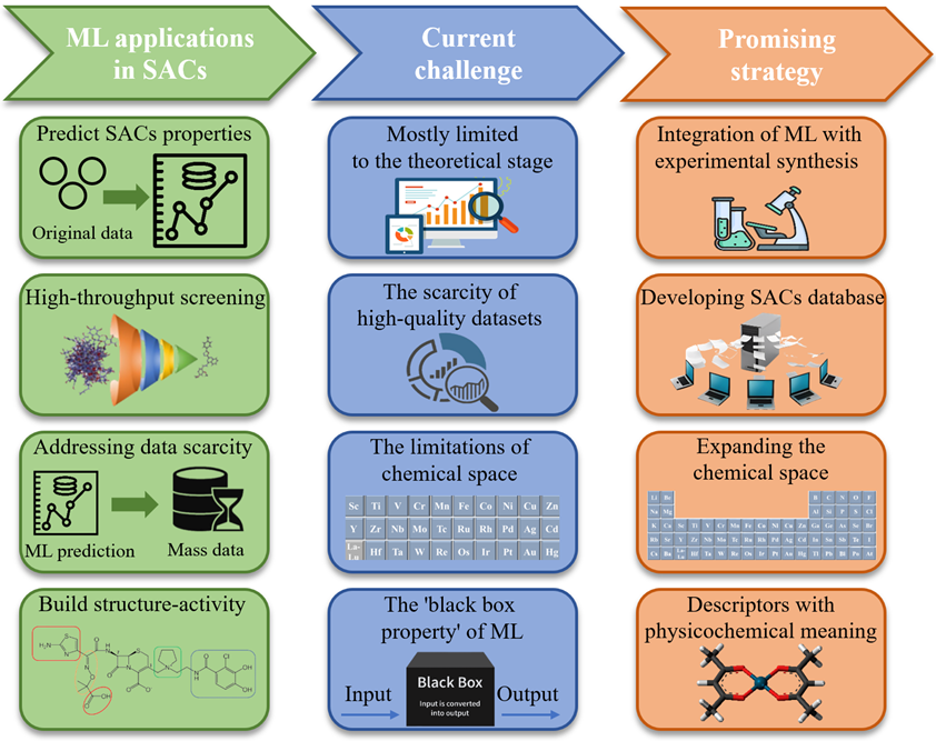 图10.机器学习在SACs中的应用示意图、当前挑战及前景策略。