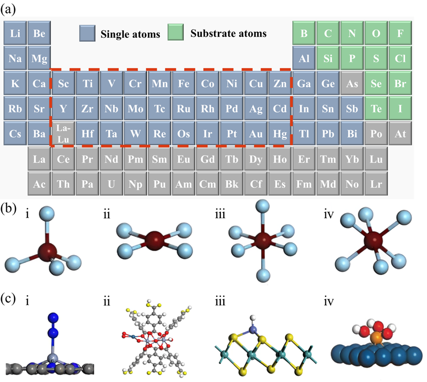 图4.(a)有可能在周期表内形成SACs的元素。蓝色:SACs常见的金属活性中心元件。绿色:SACs的常见基板元件。(b)SACs中存在的几种典型协调配置的方案。i.平面四重协调;ii.八面体配位和具有不同底物配位数的(iii,iv)过渡金属原子与其相应的结构一起被展示出。(c)SACs中的一些结构示例。i.氮分子吸附在三个氮掺杂石墨烯负载的铬单原子上;ii.MIL-101上支持铂单原子;iii.单原子Co-MoS2情况;iv.与羟基配位的单个铁原子由铂纳米粒子支撑。