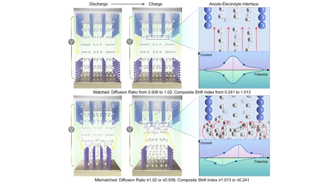 图1. 水系锌离子电池中动力学匹配与不匹配电极对的离子传输行为对比示意图。
