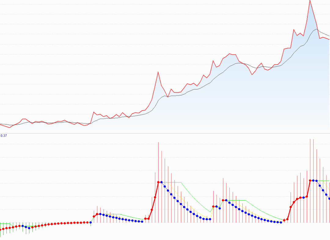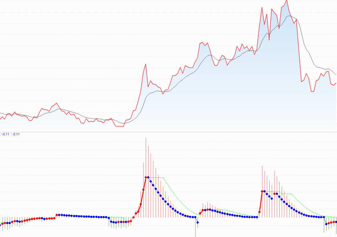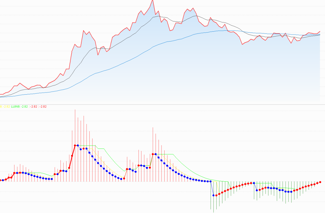 LIJIN1:=6; LIJIN2:=REF(CLOSE,1); LIJIN3:=SMA(MAX(CLOSE-LIJIN2,0),LIJIN1,1)/SMA(ABS(CLOSE-LIJIN2),LIJIN1,1); LIJIN4:=HHV(CEILING(LIJIN3)*HIGH,IF(BARSCOUNT(CLOSE)<20,BARSCOUNT(CLOSE),20)),COLORFFFF00; LIJIN5:=WMA(LIJIN4,20); LIJIN6:2*(LIJIN4-LIJIN5),COLORSTICK; LIJIN7:HHV((LIJIN4-LIJIN5),2),COLORFFFFFF; LIJIN8:HHV((LIJIN4-LIJIN5),2*2),COLOR00FFFF; LIJIN9:HHV((LIJIN4-LIJIN5),2*4),COLOR00FF00; IF(LIJIN7=LIJIN8&&LIJIN8=LIJIN9&&LIJIN6>0,LIJIN7,DRAWNULL),COLOR0000FF,LINETHICK3; IF(LIJIN7=LIJIN8&&LIJIN8=LIJIN9&&LIJIN6>0&&LIJIN8>0,LIJIN7,DRAWNULL),COLOR00FFFF; LIJIN10:=LIJIN7; LIJIN11:=LIJIN7,COLORYELLOW; LIJIN12:=REF(LIJIN10,1); IF(LIJIN11>LIJIN12,LIJIN10,DRAWNULL),LINETHICK1,COLORRED; IF(LIJIN11>LIJIN12,LIJIN10,DRAWNULL)CIRCLEDOT,LINETHICK3,COLORRED; IF(LIJIN11<=LIJIN12,LIJIN10,DRAWNULL),LINETHICK1,COLORBLUE; IF(LIJIN11<=LIJIN12,LIJIN10,DRAWNULL)CIRCLEDOT,LINETHICK3,COLORBLUE; |