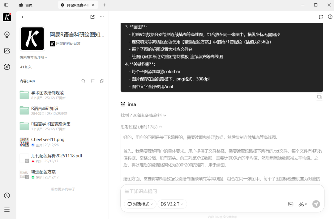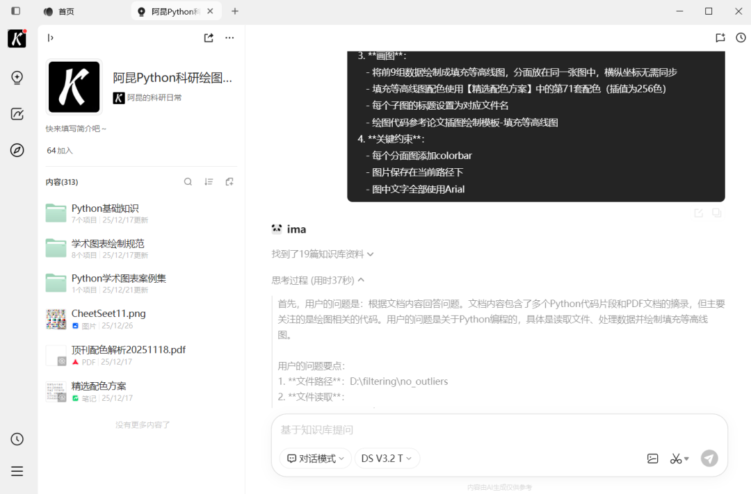首先,在AI知识库中输入指令,让AI帮我们写代码读取数据、绘制填充等高线图: